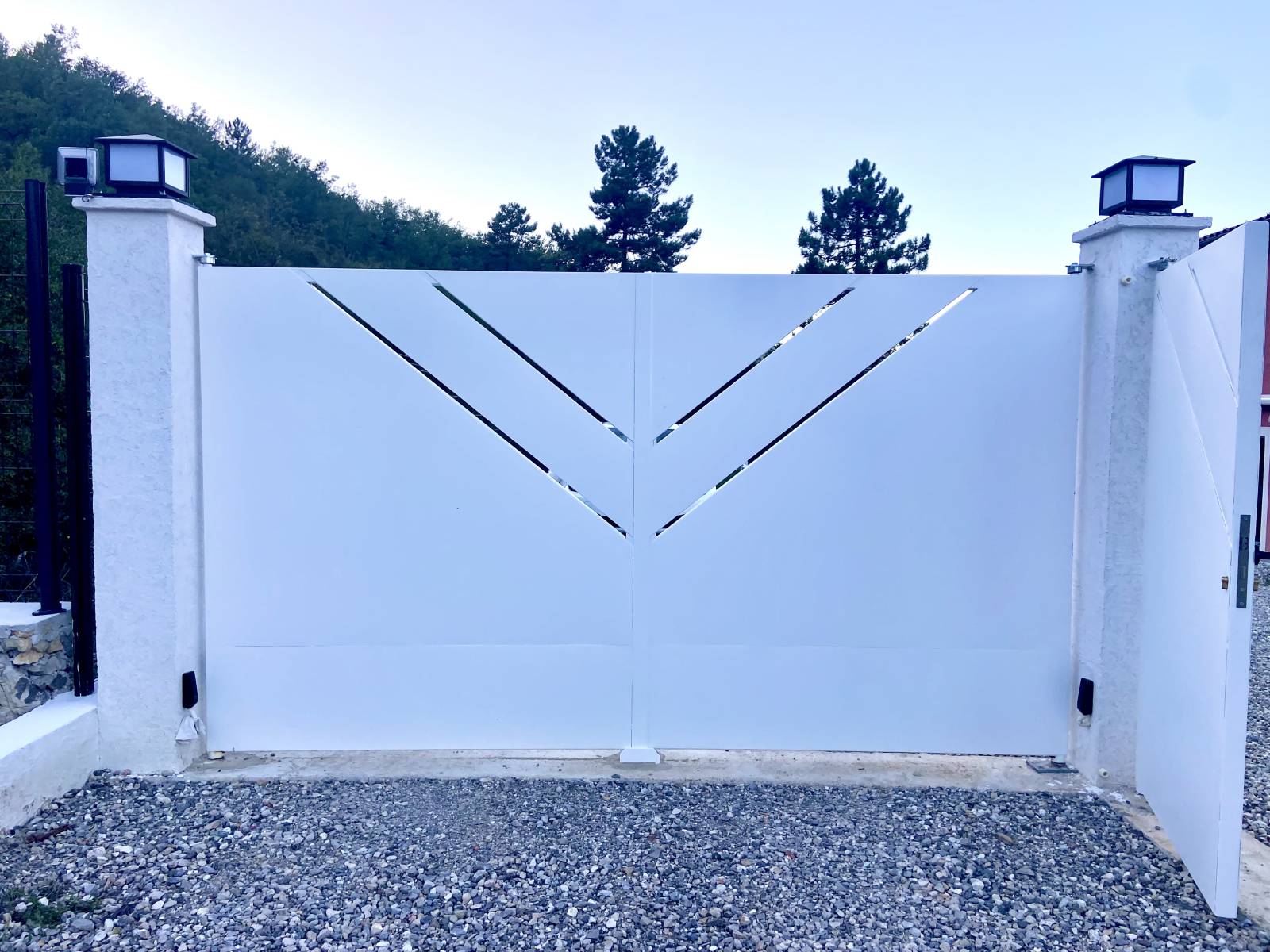 Le design occultant de ce portail battant automatisé et du portillon a été pensé par notre cliente elle-même et nous les avons créés sur mesures pour satisfaire sa demande.